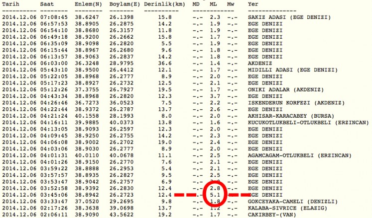 Ege Denizi’inde sabaha karşı 03. 45'te, 5.1 şiddetinde deprem meydana geldi. Deprem İzmir ve civar kentlerinde de hissedildi. Yukarıdaki tabloda Kandilli Rasathanesi kayıtlarına göre son depremler sıralanıyor. (Büyütmek için üzerine tıklayın)