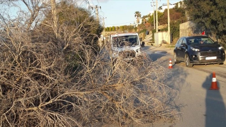 Muğla'nın Bodrum ilçesinde fırtına nedeniyle kökünden sökülerek kara yoluna devrilen ağaçlar, ulaşımda aksamalara yol açtı.