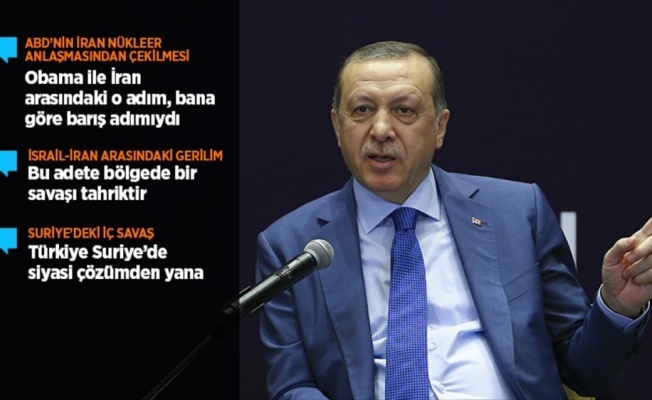 "Obama ile İran arasında atılan o adım, bana göre olumlu bir adımdı" ifadesini kullanan Erdoğan, "Bir barış adımıydı, ama şimdi bu barış ortadan kaldırılmak suretiyle yeniden bölgede bir sıkıntılı süreç başlayacak. Biz artık bunun endişesini taşıyoruz ve bu atılan adımı da doğrusu biz onaylamıyoruz, doğru da bulmuyoruz." şeklinde konuştu.