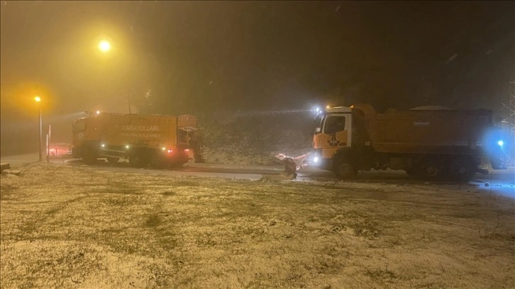 Karayolları personelinin kar küreme ve tuzlama çalışması yaptığı bölgede, polis ekipleri sürücüleri dikkatli seyretmeleri konusunda uyarıyor.