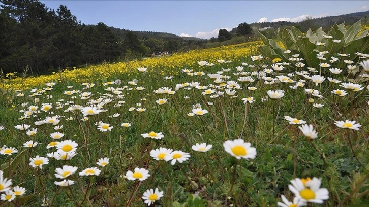 Tatil için Bolu'yu tercih edenler, Abant Gölü çevresi ve yaylalarda rengarenk çiçekler arasında gezinti yaparak hatıra fotoğrafı çektiriyor.