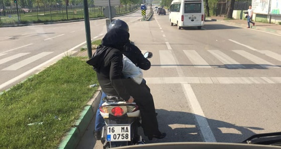 Osmangazi ilçesi Atıcılar Caddesinde ilerleyen bir motosiklette yolculuk yapan çiftten arkada yan oturan anne daha yeni doğmuş bebeğini tek eliyle tutması sorumsuzluğun bu kadarı da olmaz dedirtti. Bir eliyle düşmemek için motosikletin arkasına tutunan anne diğer eliyle de daha yeni doğmuş bebeğini tuttuğu görüldü. Oluşacak en küçük denge kaybında düşüp ölmesi kaçınılmaz olan bebeğinin akıbetinin ne olduğu ise bilinmiyor.