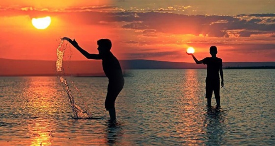 Kızıllaşan gün batımının fotoğrafları baraj gölü üzerine düşerken bölgede yaşayan vatandaşlar gün batımı ile fotoğraf çektiriyor.