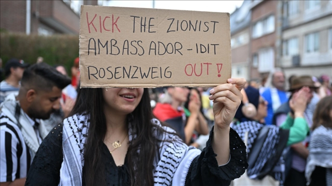 Filistin ile dayanışma sloganları atan göstericiler, 7 Ekim 2023'ten bu yana Gazze Şeridi'ne yönelik saldırılarını sürdüren İsrail'in Brüksel Büyükelçiliğinin kapatılması çağrısında bulundu.