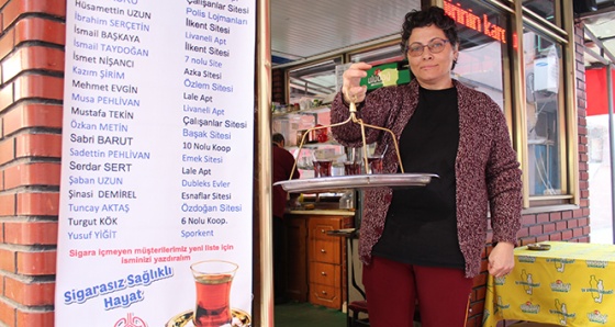 Çay ocağından sigara bırakanlara bir yandan çay ve çeşitli ikramlarda bulunan Aykan kardeşler, diğer yandan da isimlerini çay ocağının kapısının yanında duvara asılı olan listeye yazıyor.