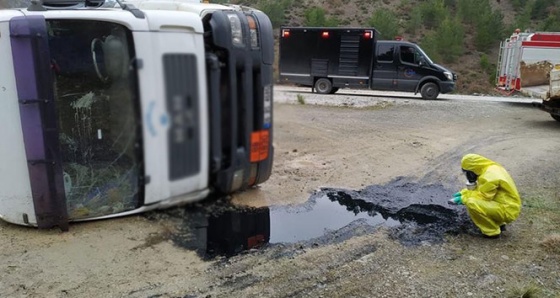 AFAD ekiplerince yol kenarına dökülen maddelerin kimyasal ölçümleri yapılarak geniş güvenlik önlemi alındı.