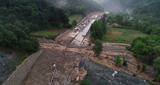 Bursa'da 4 ilçenin ulaşımını sağlayan karayolu heyelan nedeniyle kapandı. 3 araç sel suları ve yağmurun dağdan getirdiği taş ve toprak altında kalırken araç içersindeki vatandaşlar boğulmaktan son anda kurtarıldı. Yüzlerce sürücü araçlarıyla birlikte mahsur kaldıkları yolda saatlerdir beklerken heyelanın kapattığı yol ve kurtarma çalışmaları İHA tarafından havadan görüntülendi.