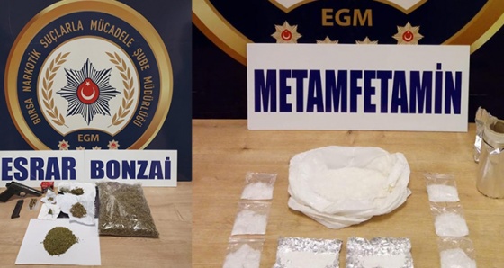 Ekipler, şahısların ev ve iş yerlerinde yapılan aramalarda 530 gram bonzai, 145 gram metamfetamin, 90 gram esrar, 1 adet ruhsatsız tabanca ele geçirdi.