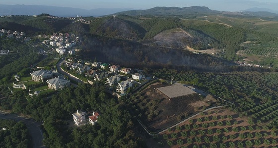 Bursa’nın Mudanya ilçesinde ünlü işadamlarının villalarının da bulunduğu hem denizi hem Uludağ’ı görebilen bölgede çıkan orman yangını 7 saat sonra kontrol altına alınabildi. Yangının ardından küle dönen alan havadan görüntülenirken, Bursa’nın önde gelen işadamlarının da yangını ucuz atlattıkları ortaya çıktı. Çağrışan Mahallesi’nde öğlen 12.30 civarında zeytinlik alanda başlayan yangın, rüzgarın etkisiyle karşı Bademli yamaçlarında villaların bulunduğu ormanlık alana sıçradı. Özellikle BTSO üyesi 20’den fazla işadamının oturduğu Şahintepe Sitesi’nin arka kısmındaki ormanlık alanda etkili olan yangın, korku ve paniğe neden oldu. Yangında aynı sitede bulunan işadamı Vakkas Parlak’a ait villanın çatısı yanarken, BTSO Başkan Vekili Remzi Topuk’un villası da zarar gördü.
