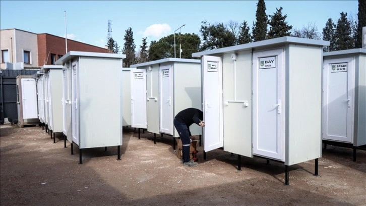 İlk etapta imal edilen 12'şer seyyar tuvalet ve duş kabinleri Kahramanmaraş'a gönderilmek için Yıldırım ilçesi Samanlı Mahallesi'ndeki bir alanda toplandı.