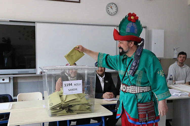 "Bugün de çok önemli bir gün. Seçim günü, demokrasi günü. Ben de Hacivat olarak dedim ki 'Hacivat kıyafetlerimle gidip bu vatandaşlık görevimizi yapalım, bir renk katalım seçimimize.