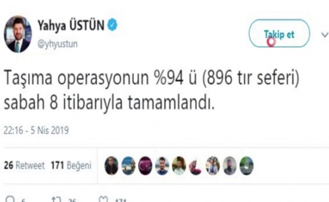 Üstün, taşınma operasyonunun yüzde 94’ünün bu sabah saat 08.00 itibariyle tamamlandığını açıkladı. Bu süreçte 896 tırın sefer yaptığı açıklandı.
