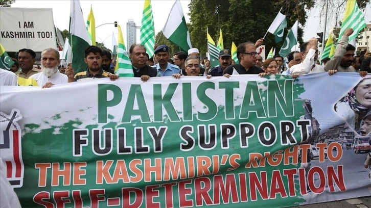 Katılımcılar, Keşmir halkına destek mesajları içeren pankartlar taşırken, Hindistan aleyhine sloganlar attı.