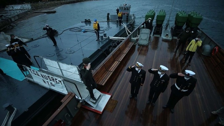Çanakkale Deniz Müzesi Komutanlığı Yüzer İskelesi'nde demirli bulunan "TCG Nusret (N-16)", mayınlarını döktüğü rotada ilerledi.