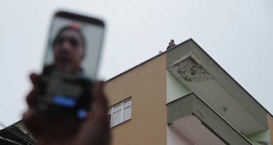 Polisler, intihar girişimi eylemini sürdüren Dayıoğlu'nu ikna etmeye çalışıyor.