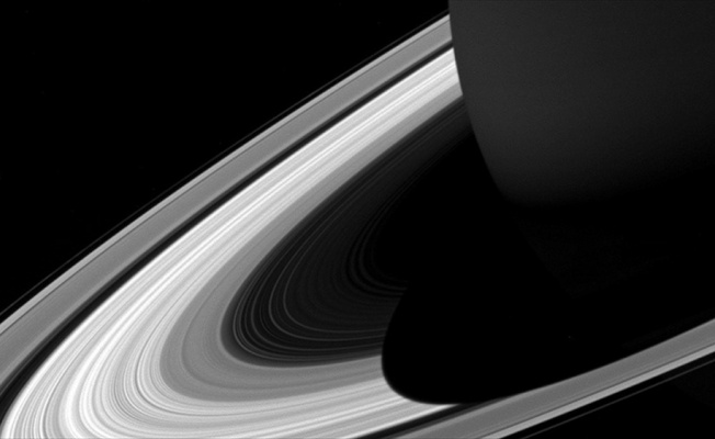 Gezegenin karanlıkta kalan bölümünden, ters ışıkta çekilen fotoğraf karesinde, Satürn'ün halkaları karanlık bir bant gibi ön planı kaplıyor.