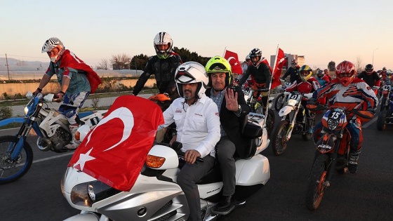 Bakan Çavuşoğlu, makam aracından inerek kendisini bayraklarla karşılayan motosikletli sporcularla bir süre konuştu. Kask takarak, Ali Ekber Ekici'nin kullandığı motosiklete binen Çavuşoğlu, halka hitap edeceği Cumhuriyet Meydanı'na gitti.