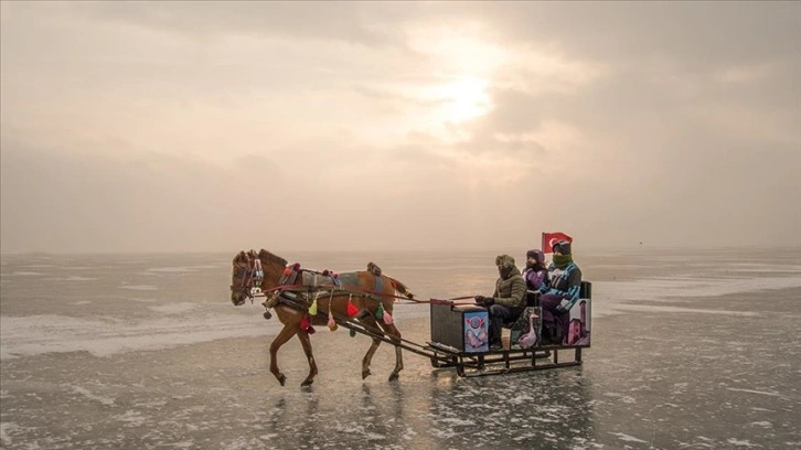 Yarıyıl tatili nedeniyle de Çıldır'a gelen ziyaretçiler, buz üzerinde yürüyerek büyülü manzaranın tadını çıkarıyor, atlı kızak ve kar motoruyla göl üzerinde geziyor.