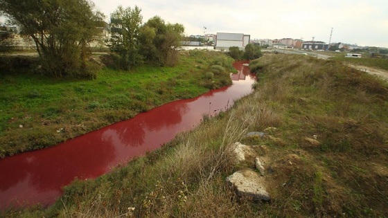 Tamamen pembe ve kırmızı renge bürünen dere çevre kirliliğini gözler önüne serdi.