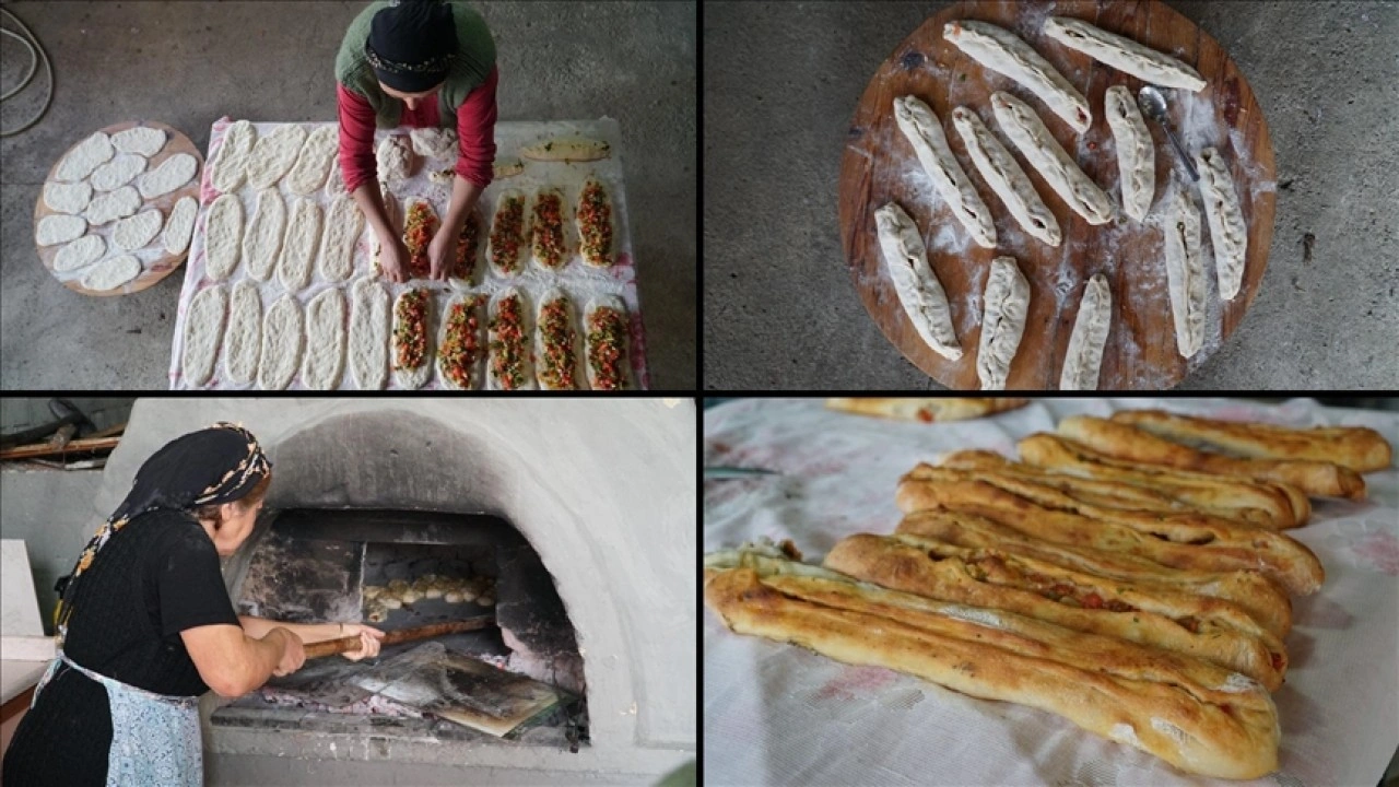 Evlerinde hamurunu ve iç malzemesini hazırlayan kadınlar, fırında kaşarlı, peynirli, çökelekli, kıymalı ile sebzeli pidelerini pişiriyor.