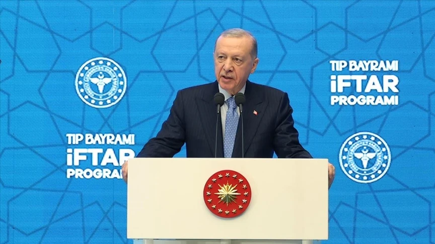 Cumhurbaşkanı Recep Tayyip Erdoğan, 14 Mart Tıp Bayramı dolayısıyla Başakşehir Çam ve Sakura Şehir Hastanesi'nde sağlık çalışanlarıyla bir araya geldiği iftar programında yaptığı konuşmada, sofralarını sağlık çalışanlarıyla paylaşmanın memnuniyeti içerisinde olduğunu söyledi.