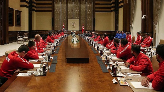 Cumhurbaşkanlığı Külliyesi'nde basına kapalı gerçekleştirilen kabul, yaklaşık 2 saat sürdü. Erdoğan, kabulde milli sporcularla tek tek tokalaştı, ayaküstü sohbet etti.