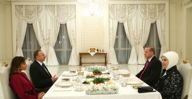 Azerbaycan Cumhurbaşkanı İlham Aliyev ile ikili görüşme gerçekleştiren Erdoğan, daha sonra İlham Aliyev ve eşi Mehriban Aliyeva tarafından onuruna verilen akşam yemeğine katıldı.