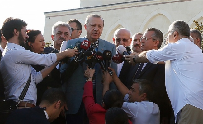 Erdoğan, bayram namazı sonrası gazetecilere yaptığı açıklamada, tüm halkın Ramazan Bayramı'nı tebrik ederek, bayramın İslam dünyasının birliğine, beraberliğine özellikle de barışına vesile olması temennisinde bulundu.