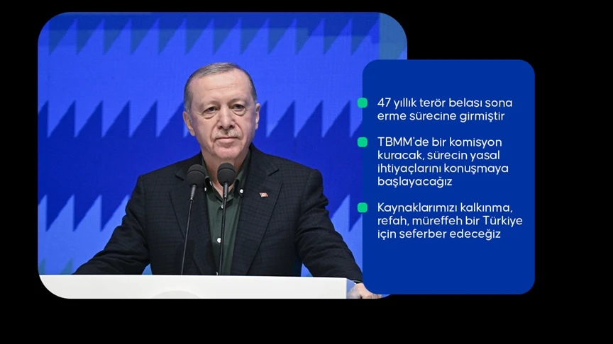 Terör örgütü PKK'nın, İmralı'nın çağrısıyla kongresini topladığını ve kendisini feshettiğini açıkladığını anımsatan Erdoğan, "Dün de örgüt aldığı kararı hayata geçirdiğini, özellikle de bir merasim yaparak silahlarını bıraktı. Dün itibarıyla 47 yıllık terör belası inşallah sona erme sürecine girmiştir. Türkiye uzun, acılı, sancılı, gözyaşlarıyla dolu bir sayfayı dün itibarıyla kapatmaya başlamıştır. Bugün unutmayalım, yeni bir gündür. Bugün tarihte yeni bir sayfa açılmıştır. Bugün büyük Türkiye'nin, güçlü Türkiye'nin, Türkiye Yüzyılı'nın kapılarını ardına kadar aralanmıştır." dedi.