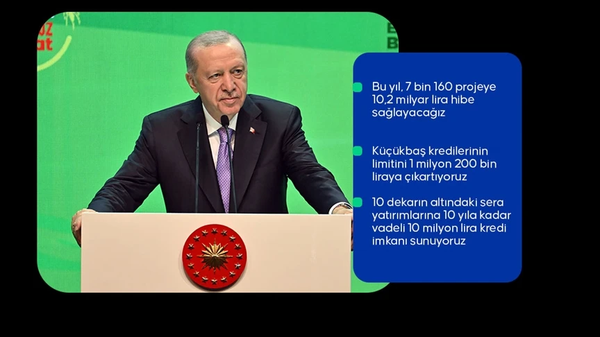 Cumhurbaşkanı Erdoğan, "Bu yıl tarım ürünlerinin işlenmesi, paketlenmesi, depolanması ile bireysel sulamadan oluşan 7 bin 160 projeye 10,2 milyar lira hibe sağlayacağız." dedi.