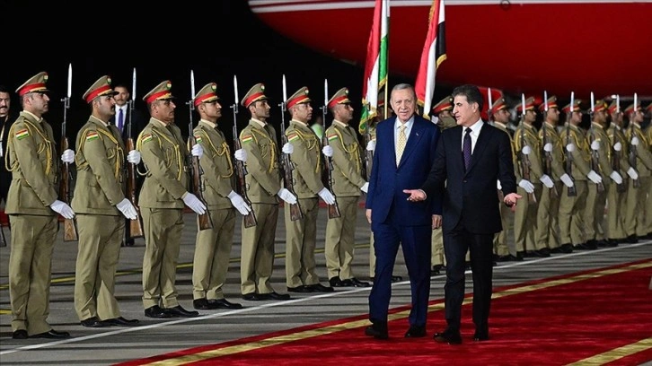 Cumhurbaşkanı Erdoğan, Erbil Uluslararası Havalimanı'nda Irak Kürt Bölgesel Yönetimi (IKBY) Başkanı Neçirvan Barzani ve IKBY Başbakanı Mesrur Barzani tarafından karşılandı.