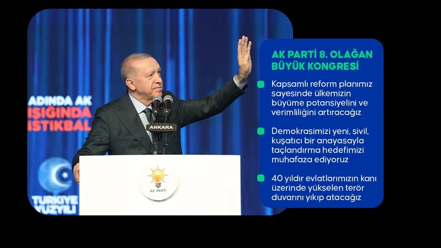 Erdoğan, Ankara Spor Salonu'nda düzenlenen AK Parti 8. Olağan Büyük Kongresi'ndeki konuşmasında, ekonomide ve demokraside elde ettikleri tüm başarıları, reform iradelerinin sürekliliğine borçlu olduklarını söyledi.