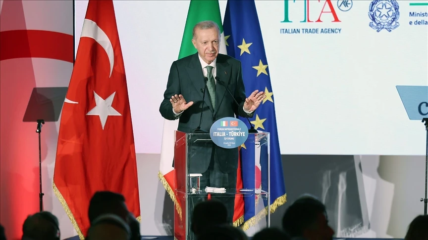Erdoğan, bir otelde, Ticaret Bakanlığı, Dış Ekonomik İlişkiler Kurulu (DEİK), İtalya Dışişleri Bakanlığı ve İtalyan Ticaret Ajansı tarafından düzenlenen Türkiye-İtalya İş Forumu'nda yaptığı konuşmada, İtalya Başbakanı Giorgia Meloni'ye nazik misafirperverliği için teşekkür etti.