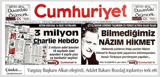 Saldırgan tutumuyla bilinen, 12 çalışanı da saldırı sonucu öldürülen Charlie Hebdo dergisinin bir bölümünü yayınlayan Cumhuriyet Gazetesi hakkında İstanbul Cumhuriyet Başsavcılığı resen soruşturma başlattı. Soruşturmayı yürüten Basın Suçları Savcısı Vedat Yiğit’in “Halkı kin ve düşmanlığa tahrik ve aşağılama” suçundan, karikatürleri köşelerinde kullanan 2 yazarı ifadeye çağıracağı öğrenildi.