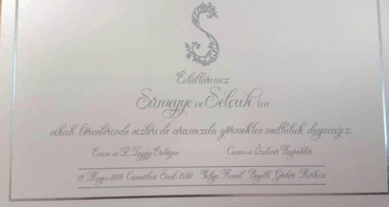 Sade nikâh davetiyesinde, Sümeyye Erdoğan ile Selçuk Bayraktar’ın isimlerinin baş harfi ‘S’, iki sarmaşık dalıyla oluşturulmuş. Davetiyede, çiçek ve çelenk göndermek isteyenlerin bunun yerine, TSK Mehmetçik Vakfı, TSK Dayanışma Vakfı ve Türk Polis Teşkilatı Güçlendirme Vakfı’na bağış yapmaları isteniyor.