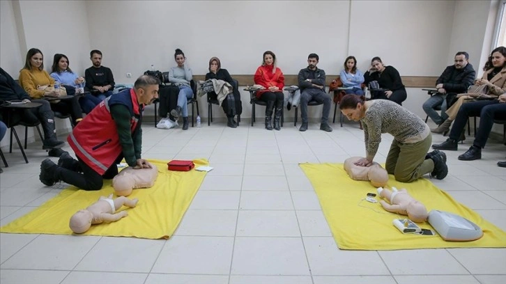 Kentteki eğitimlerini sürdüren 5 öğretmen, Kahramanmaraş merkezli depremlerin ardından ilk yardım eğitimlerine ilgi gösteren meslektaşlarına önce teorik sonra da uygulamalı eğitimler veriyor.