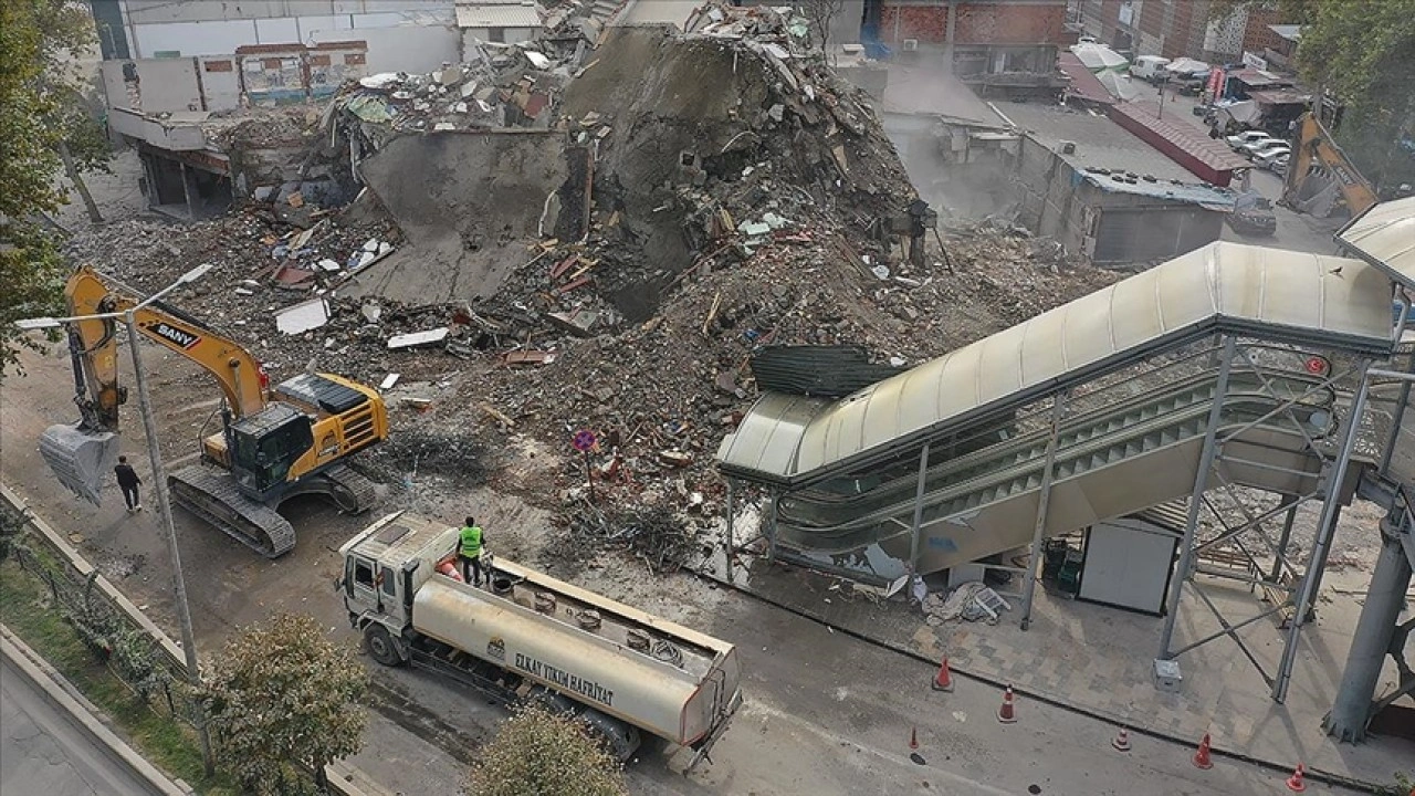 Ekiplerin çevresinde önlem aldığı ağır hasarlı bina, iş makineleriyle kontrollü yıkıldı. Çıkan moloz, kamyonlarla enkaz döküm alanlarına taşındı.
