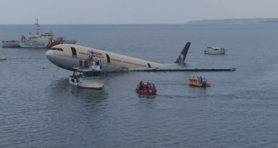 Yaklaşık 2 saat süren çalışmalarda dev uçak denize batırıldı.