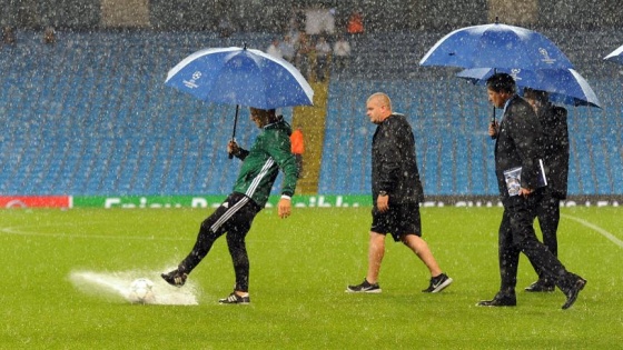 Açıklamada, Manchester kentindeki Etihad Stadı'nda yoğun yağmur yağışının devam etmesi nedeniyle bu yönde bir karar alındığı ve karşılaşmanın oynanacağı tarihin daha sonra belirleneceği ifade edildi.
