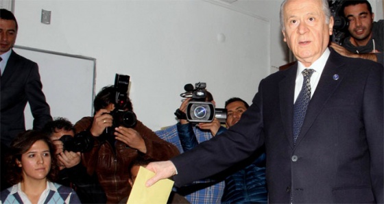 Bahçeli, '1 Kasım seçiminde AKP'nin aldığı oy miktarı geçmiş 13 yıllık hezimet döneminin kapatılması; onca yolsuzluk, onca yanlışlık, onca yozlaşma ve yolsuzluğun örtülmesi anlamına kesinlikle gelmeyecektir. Türkiye'nin içinde kıvrandığı hazin tabloyu hiçbir sonuç değiştiremeyecektir. Elbette aziz milletimizin sandıkta verdiği karara saygı duyup riayet etmekle mükellef olduğumuzun farkındayız. Fakat AKP'ye verilen her oyun, verilen her desteğin istikrarı getirmek şöyle dursun; geçen yılları mumla aratacak felaketlere davetiye çıkaracağını da şimdiden iddia ve ilan ediyoruz. Ortada AKP'nin bir zaferinden ziyade, beyaz Toroslarla gözü korkutulmuş, terörle yıldırılmış, canlı bombalarla huzuru kaçırılmış, ekonomik tehlikelerle aklı çelinmiş, anti demokratik uygulamalarla iradesine ket vurulmuş bir sosyolojik yapı vardır ve her yönüyle de açıktadır. Bundan sonra doğru bildiklerimizi, doğru gördüklerimizi, tertemiz vicdanlarımızla, dürüst bir mizaçla, herhangi bir gönül kırgınlığı olmadan milletimizle paylaşmayı sürdüreceğiz' ifadelerini kullandı.