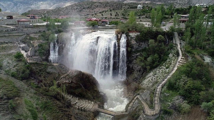 Uluslararası Sakin Kentler Birliğince Türkiye'nin 11. sakin kenti seçilen Erzurum'un Uzundere ilçesindeki Tortum Şelalesi, dağlardaki karın erimesi ve yağışların bol olması nedeniyle coşkun şekilde akıyor.