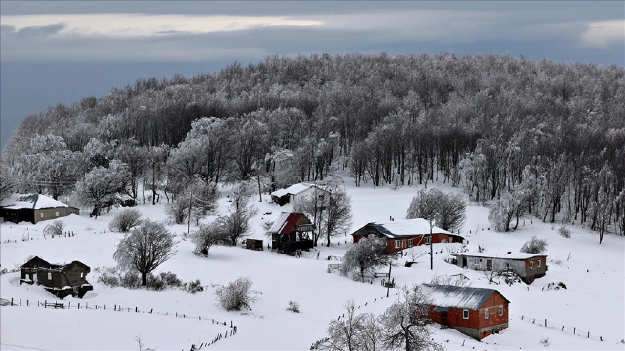 Kar yağışının ardından etkileyici güzelliğe bürünen Kocadağ Yaylası, dronla görüntülendi.