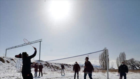 Kars'ın Selim ilçesine bağlı Karahamza köyüne giden yetkililer, buradaki karla kaplı okul bahçesinde kömür tozu kullanarak badminton sahası oluşturdu.