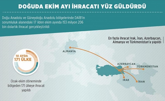 AA muhabirinin, DAİB verilerinden yaptığı derlemeye göre, bu yılın ekim döneminde, DAİB'in Doğu Anadolu ve Güneydoğu Anadolu bölgelerindeki sorumluluk alanında yer alan Ağrı, Ardahan, Batman, Bayburt, Bingöl, Bitlis, Erzurum, Erzincan, Elazığ, Iğdır, Hakkari, Muş, Şırnak, Tunceli, Van, Kars ve Siirt'ten 171 ülkeye ihracat gerçekleştirildi.
