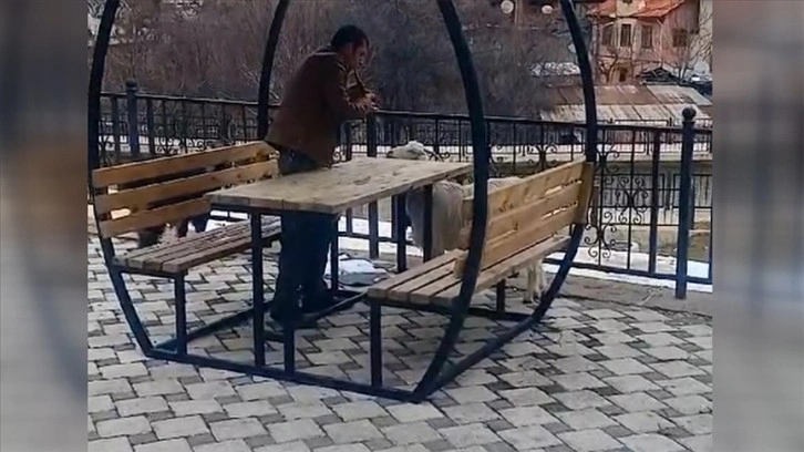 Bu sırada durağın yakınında otlayan sürüden ayrılan 2 keçi, Çelik'in yanına geldi.