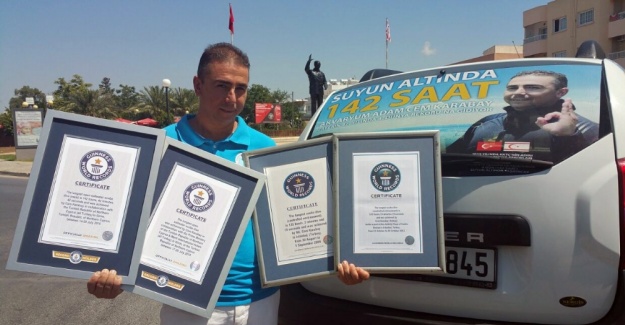 KKTC’de Yavuz Çıkarma Plajı’nda denizin altından hiç çıkmadan 142 saat 42 dakika 42 saniye kalan Cem Karabay, Guinness Dünya Rekorları Kitabı’nın gönderdiği hakemden 4. Guinness Dünya Rekoru resmi sertifikasını aldı.