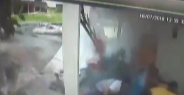 Brezilya’da kaydedilen görüntülerde, çardakta barbekü yapan şahısların ani bir sesle irkildikleri görülüyor. Şahıslar, kaçmaya fırsat bulamadan, patlayan borudan gelen suyun şiddetine dayanamayan duvar çöküyor. Canlarını zor kurtaran şahısların, panikle kaçması, güvenlik kamerasına anbean böyle yansıyor.