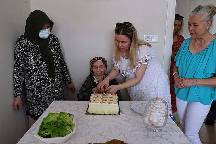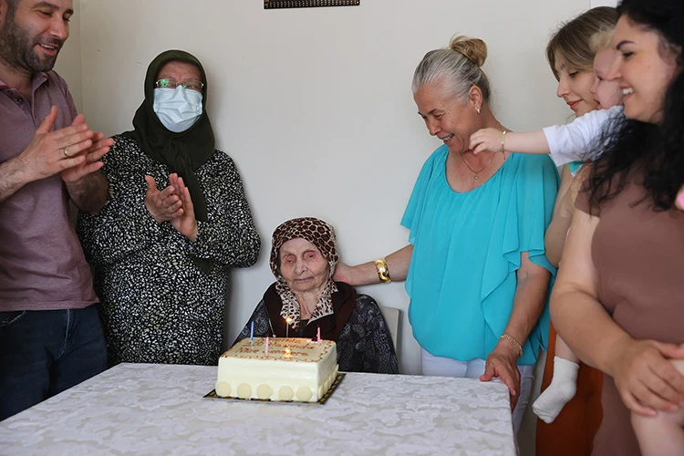 Yılmaz için birlikte yaşadığı kızı Nurten Şahin'in evinde düzenlenen kutlamada, "Ninemiz 100 yaşında, nice senelere" yazılı doğum günü pastası hazırlandı.