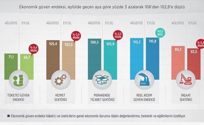 Buna göre, ekonomik güven endeksi eylülde ağustosa göre yüzde 3 azalarak 106 değerinden 102,8'e düştü. Ekonomik güven endeksindeki düşüş inşaat sektörü, tüketici, perakende ticaret sektörü ve hizmet sektörü güven endeksindeki düşüşlerden kaynaklandı.
