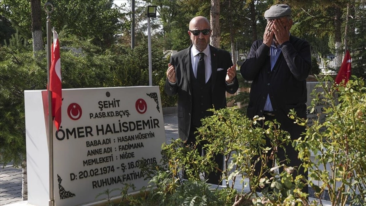 Şehit Halisdemir'in kabri başında dua eden ve Kur'an-ı Kerim tilavetini dinleyen Aksakallı, mezarlıkta bulunan vatandaşlarla sohbet ederek, fotoğraf çektirdi.